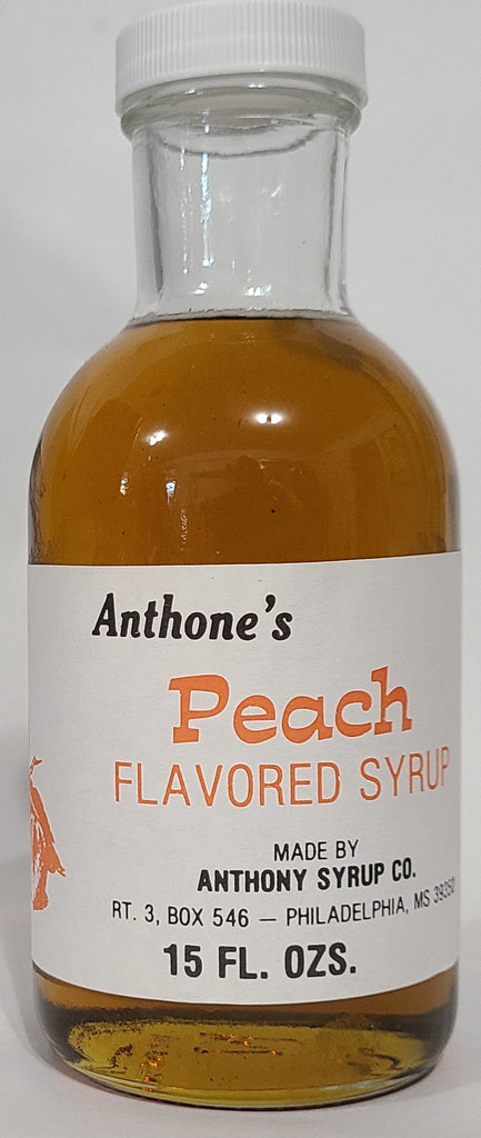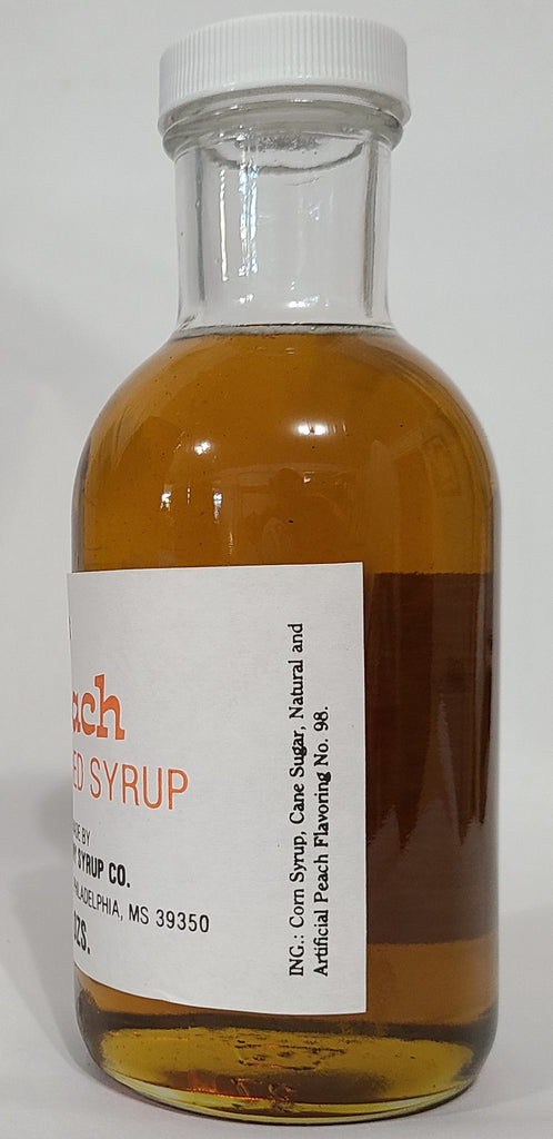 Peach blended syrup in 12 Fluid Oz Glass Bottle Contains natural and artificial flavoring Made in Mississippi USA