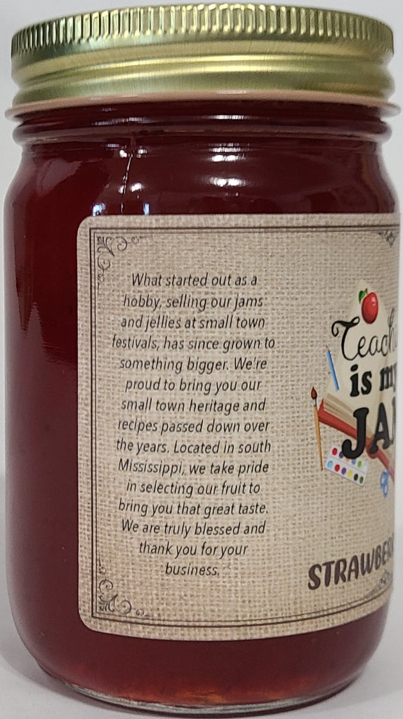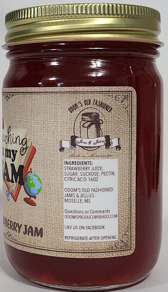 Teaching Jam in Glass Jar is tribute to our teachers during the covid time . Strawberry Jam in Glass 16 oz Net Wt Jar Odems old time recipe Made from the Strawberries. Made in Mississippi USA